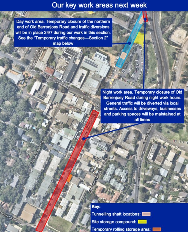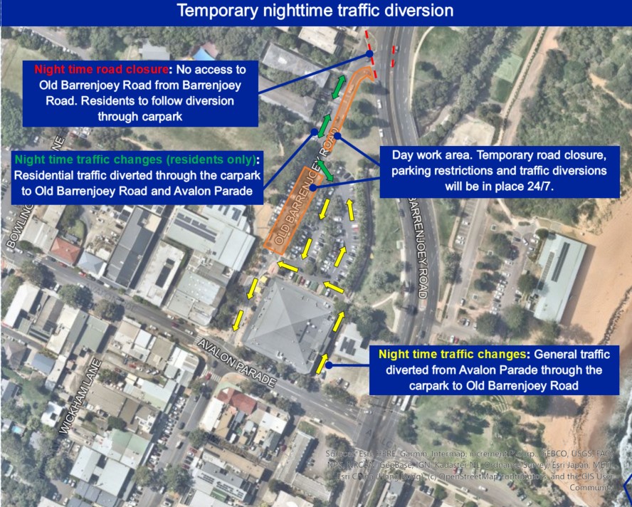 - temporarily closing Old Barrenjoey Road between Avalon Parade and The Crescent during our night work hours – see ‘Our key work areas next week’ map below. General traffic will be diverted via local streets. Access to driveways, businesses and parking spaces will be maintained at all times. Our traffic controllers will be on site to assist and to help keep traffic flowing safely.