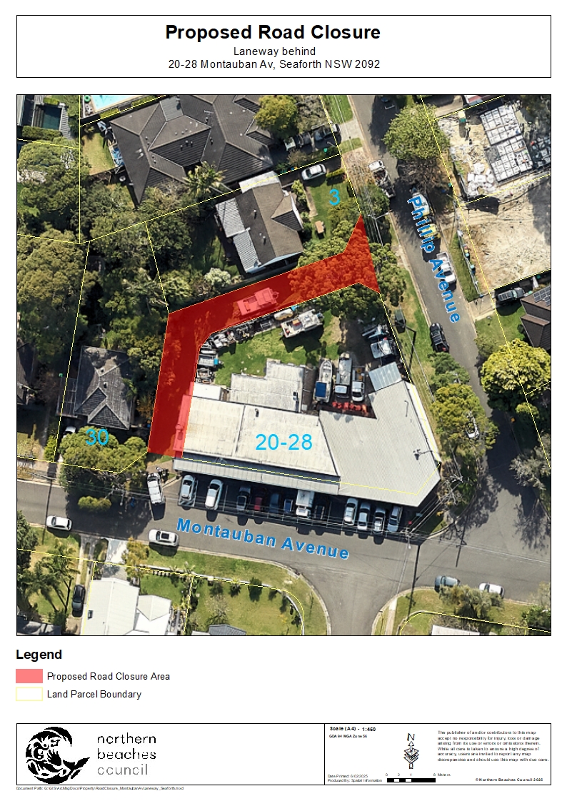 On Tuesday May 13 2025 the council stated;'Notice is hereby given that Council proposes to close the council lane behind 20-28 Montauban Avenue, Seaforth, between Montauban Avenue and Phillip Avenue.