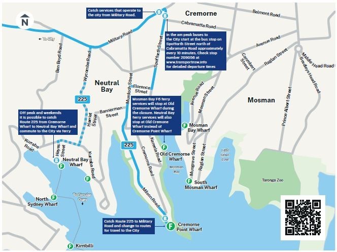 Alternative transport options- Taronga Zoo (F2) commuter services during AM and PM peak periods will be redirected to the Old Cremorne Wharf (900m walk)