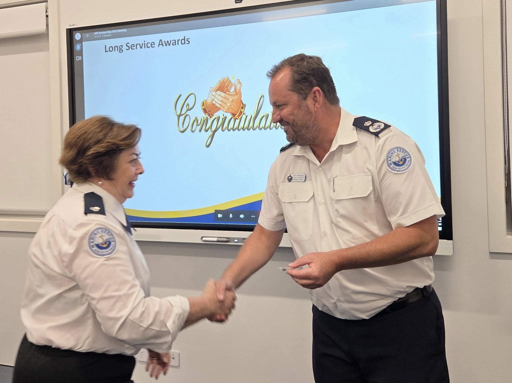 A huge congratulations to Mike Charlton (Unit Commander - Broken Bay) for receiving his 15 year National Medal. Thank you for your service. Presented by Dan Duemmer, Acting Deputy