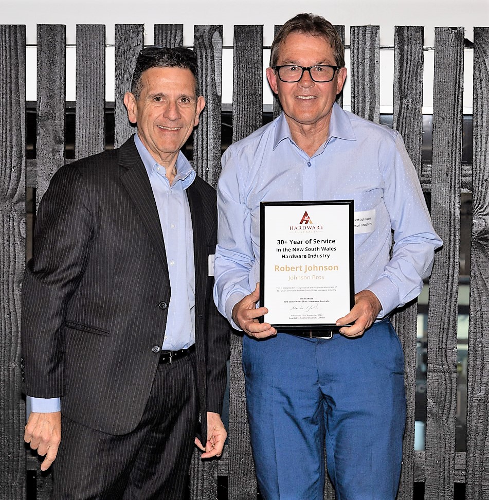 Congratulations to Robert Johnson on receiving the award for "30+ Years of service in the NSW Hardware Industry" from Hardware Australia at their September 2022 Awards (PS... It might be over 40).Congratulations as well to Johnson Brothers Mitre 10 stores at Mona Vale and Avalon for being named as Finalists in this years' Awards. The best Hardware stores, service and knowledge in our community.