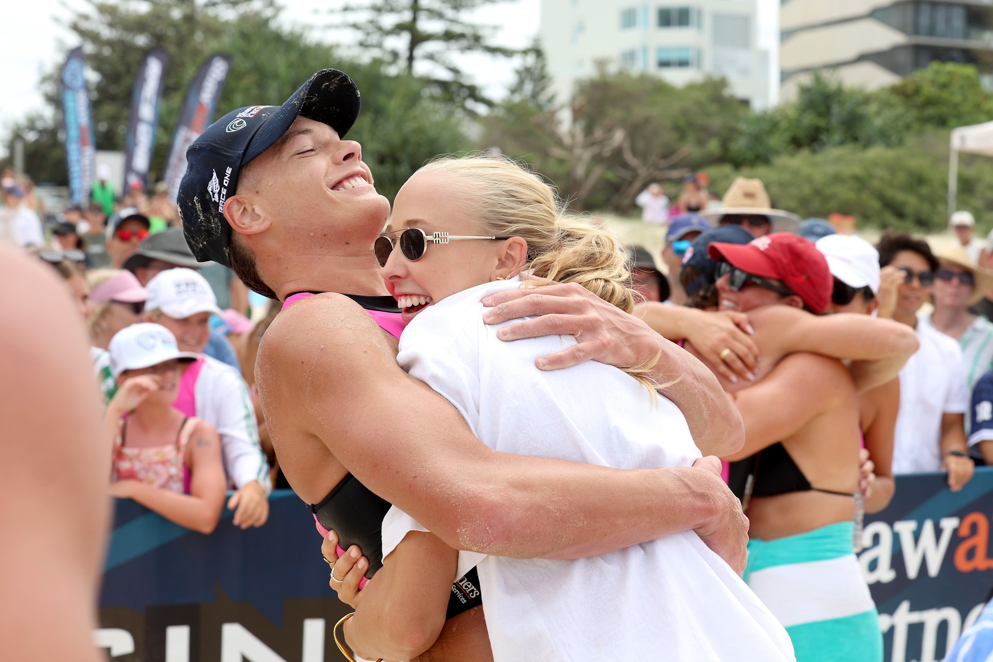 But it was Lucy who got over the top of the wave, navigating it all the way to shore where she was greeted by her Ironman boyfriend Finn Askew.