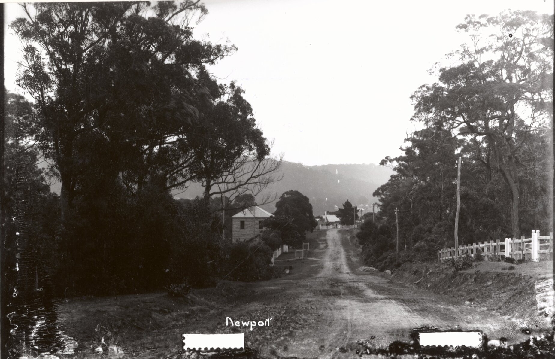 Beaconsfield Street Newport, circa 1900, Item: FL11281565, NSW Records and Archives - white paling fence of Newport school on right, Houreaux stone house on left, taken from just near Crescent road turn off to left.