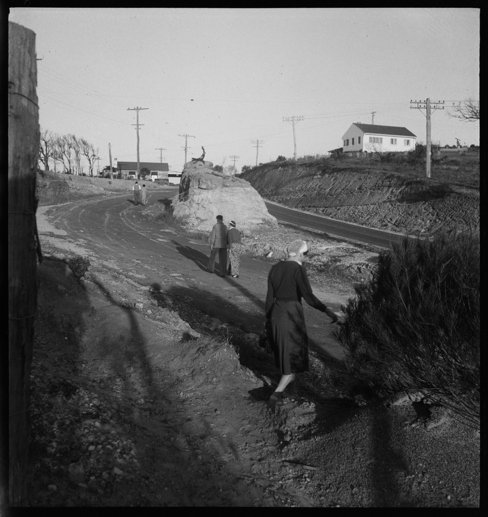 The Road leading up the hill between Mona Vale and Newport - this spot is near Bushrangers Hill at thew top of the stretch that goes over Bungan and towards Newport - the road on the right of the picture will become the Barrenjoey road - these road works were done, alike that out past Church Point to Coal and Candle Creek, through Australian Depression Work Relief Programs. If you come out of The Avenue in Newport now, on the Bungan-Newport ridge, you are looking straight across to that rock face on the right, although clearly the road has been widened since then. ABHS Photo
