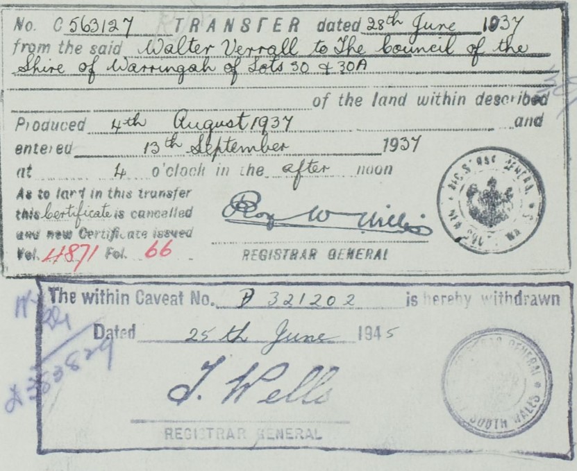 An area alongside the water, measuring of 2 acres and 36 perches, was resumed by Warringah Shire Council in 1937 from Walter Verrall. The WSC was continuing its policy to ensure residents had access to the waterfront of the Pittwater estuary and place to play – which also befitted local wildlife in this instance as their habitat was retained.