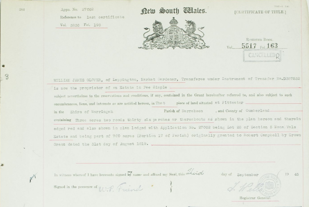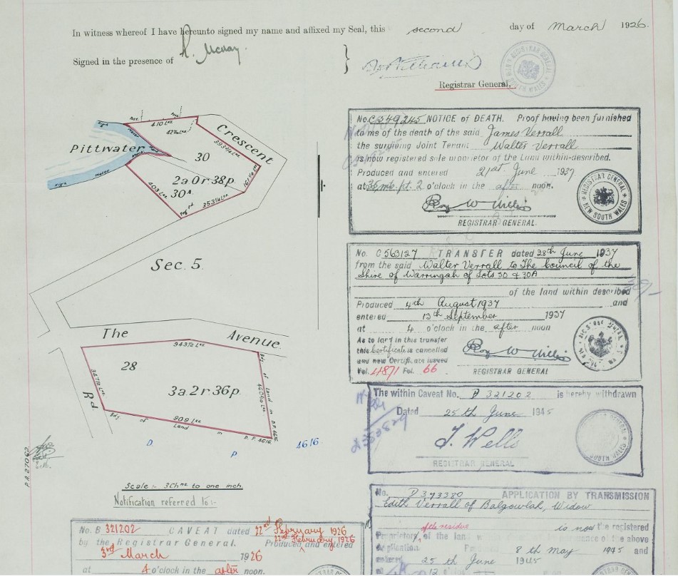 No. 27,062. James Verrall and Walter Verrall, 3 a. 2 r. 36 p., cor. The 'Avenue and Crescent-rd., and 2 a. 0 r. 38 p., lots 30 and 30a, sec. 5, front. Crescent-rd. and Pittwater. NOTICE UNDER REAL PROPERTY ACT. (1925, December 24). Government Gazette of the State of New South Wales (Sydney, NSW : 1901 - 2001), p. 5728. Retrieved from http://nla.gov.au/nla.news-article223018175