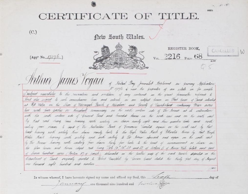 Arthur James Vogan Crescent Road & The Avenue at Pitt Water Shire Warringah Parish Narrabeen Volume 2216 Folio 68: