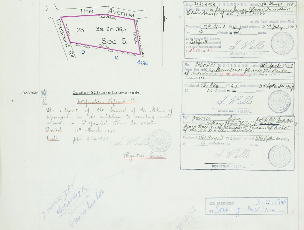 The Certificate of Title for Crescent Reserve is registered on September 17 1937 and can be seen in Vol-Fol: 4871-66: