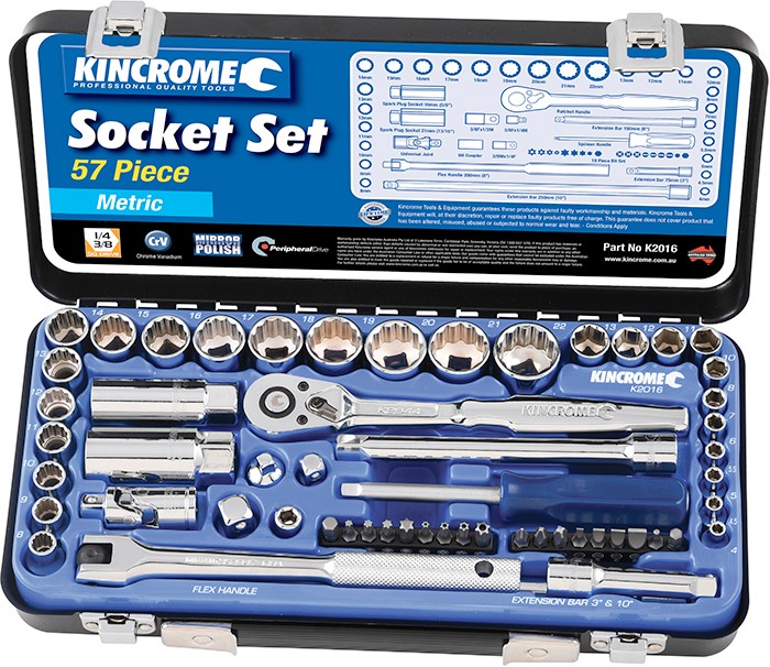 Kincrome Socket Set: $85.00 - 57pce. 1/4” and 3/8” socketry. Chrome vanadium steel. Lifetime warranty