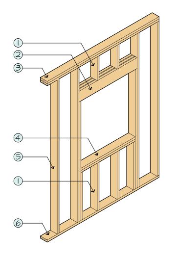 1. Stud - 2. Lintel - 3. Top plate / upper wall plate - 4. Window sill/Sill trimmer - 5. Stud - 6. Bottom plate. 7. Noggins(the horizontal bracing between the studs.