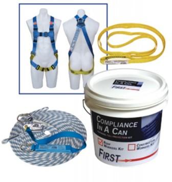 Right: First Roof Workers Kit $380.00: QUICK OVERVIEW • Ideal for workers required to work on roofs and building edges, the First Roof Workers Kit contains a rope lifeline of 15m with integral shock absorbing lanyard, 1. • 5m round strap and a fall arrest harness, all in a carry bucket for your convenience. See more at: mitre10.com.au/protection-kit-roof-workers