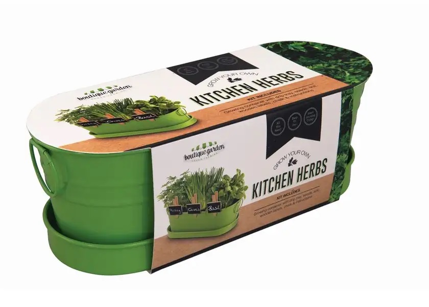This Kitchen Herbs windowsill kit has everything you need to get started including 3 of the most popular growing herbs in Australia - basil, chives & parsley. Each kit comes with a coloured metal pot with drainage holes and drip tray, seeds, soil pellet and plant tags with chalkboard. Dimensions (mm): 275L x 110W x 95H. Tin made of galvanised steel with zinc coating.