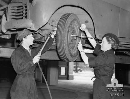 Left: MELBOURNE, VIC. 1942-09. DRIVER CHERRY WALKER AND DRIVER KIT PEEL OF THE AUSTRALIAN WOMEN'S ARMY SERVICE AT WORK ON A MILITARY STAFF CAR AT TISHLER'S GARAGE, ST. KILDA ROAD.