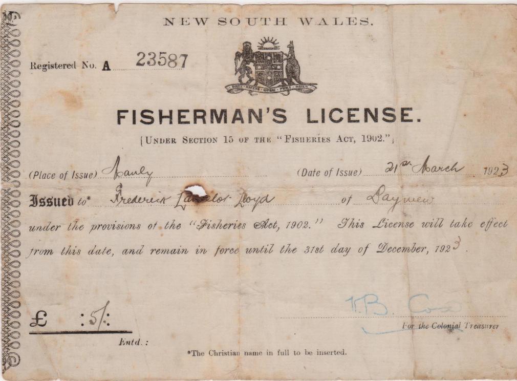 His fishing licence is dated 1923. There were two Fred Lloyds next door to each other at Church Point - one my grandfather, one my great-grandfather. (See Below)