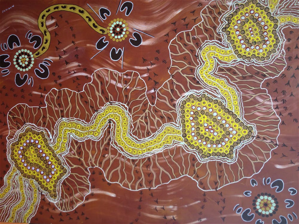 Leanne Watson’s painting Waterholes, inspired by the project, expresses this sense of Country. Her painting represents the beautiful lagoons around Ebenezer near Wilberforce and all the nourishment and materials they offered people. Now we can name some of those lagoons: Boollangay, Marrumboollo, Kallangang.