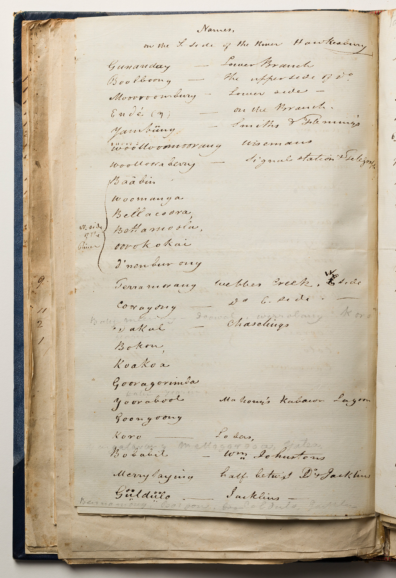 A page from Rev McGarvie’s 1829 list of Aboriginal names for places on Dyarubbin, the Hawkesbury River. Mitchell Library, State Library of New South Wales
