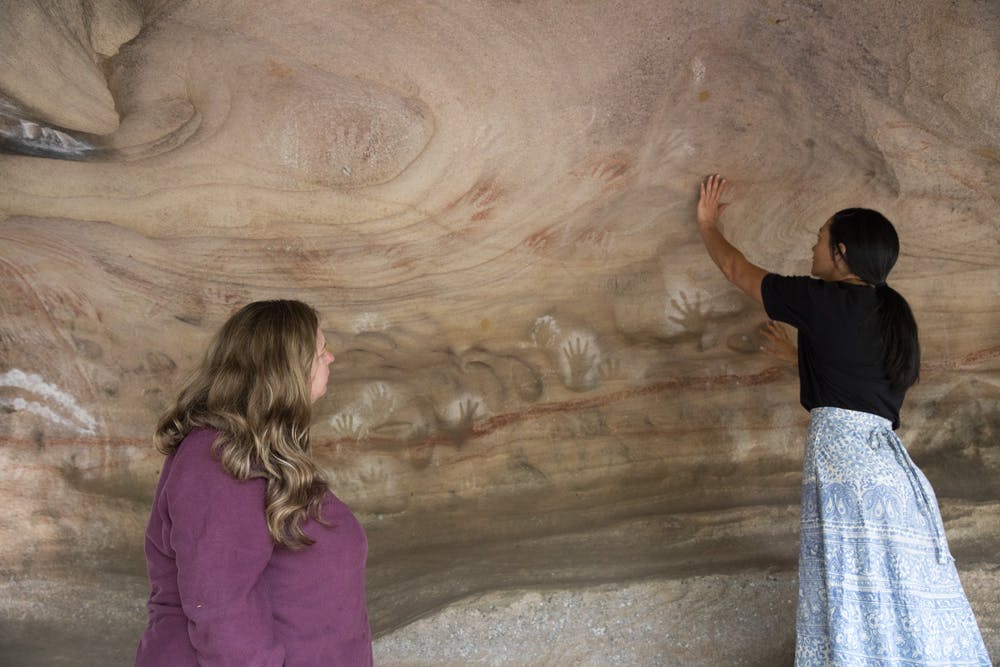Darug women Jasmine Seymour and Rhiannon Wright visit a painted rock shelter. Joy Lai