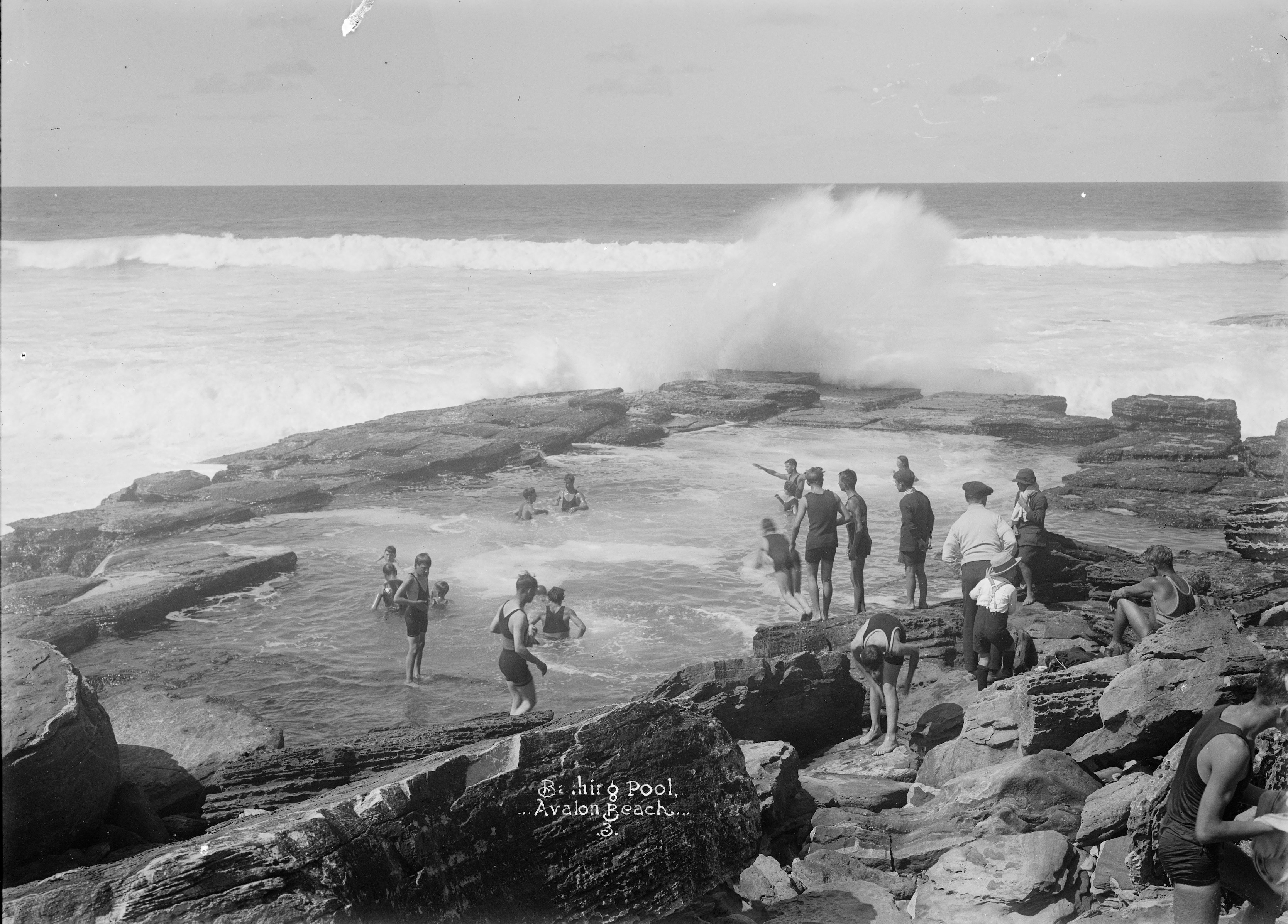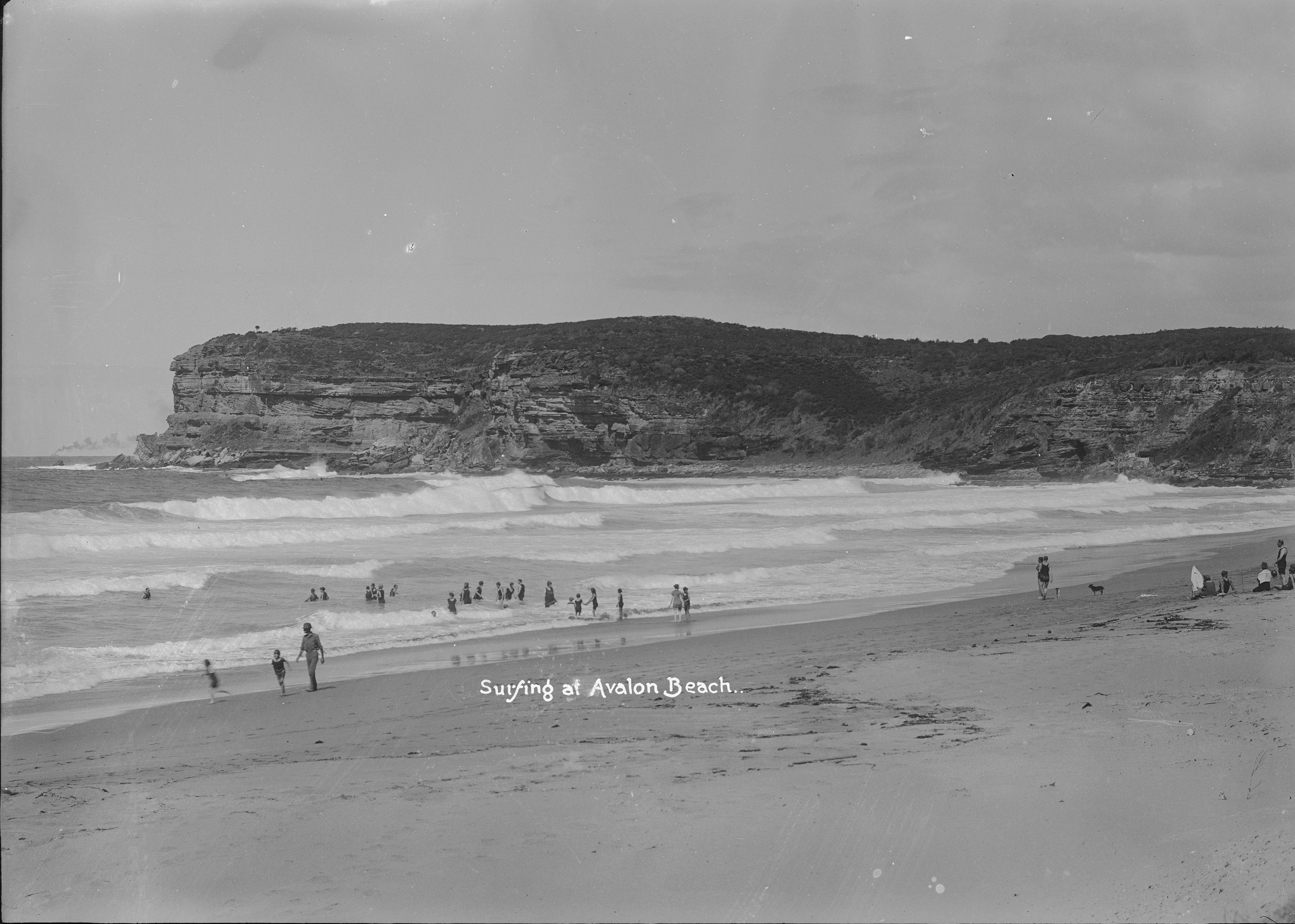 Surfing, Avalon Beach - from album: 'Series 03: Panoramic negatives of Sydney and surrounding suburbs, circa 1919-1925' / photographed by Rex Hazlewood, Item: a1949035h and enlarged sections from to show details, courtesy Mitchell Library, State Library of New South Wales