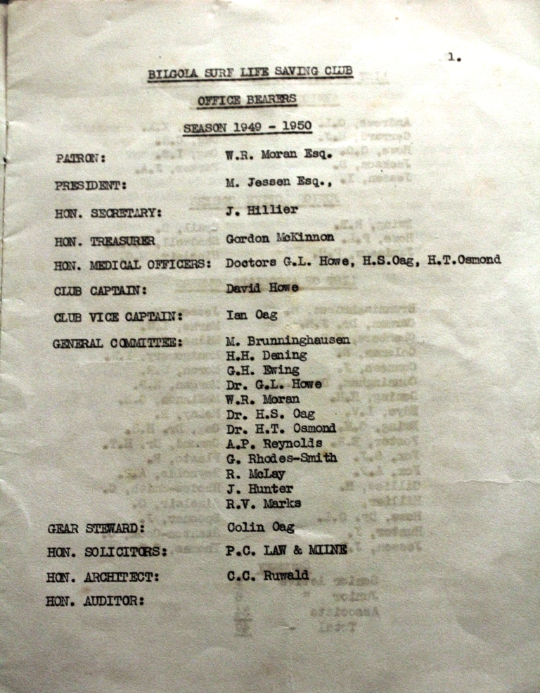 The gear at the club was at that stage stored in the garage of the Dr. Oag family, one of the families who had a house on the beach. Their sons Colin and Ian were original members.