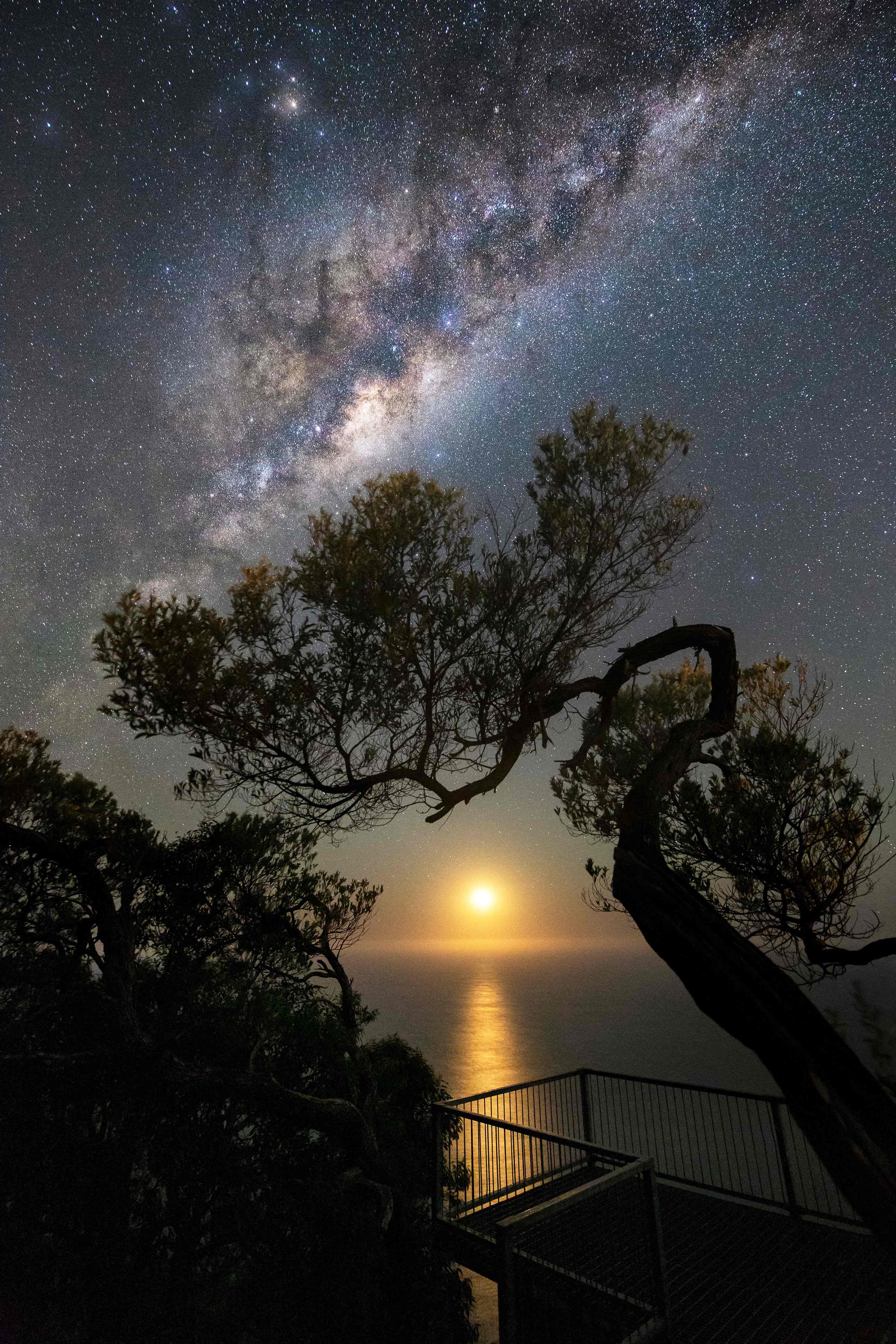 Jong Lee is the overall winner of the 2023 David Malin Awards. His photo, Rising Together, encapsulates a mesmerising convergence of the Moon and the Milky Way in a single frame. This captivating image was captured at the Tomaree Mountain Lookout on Worimi Country, NSW. Photograph: Jong Lee/David Malin awards