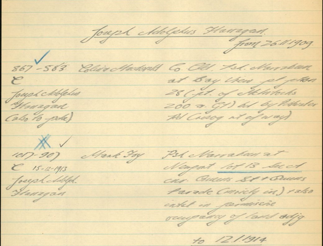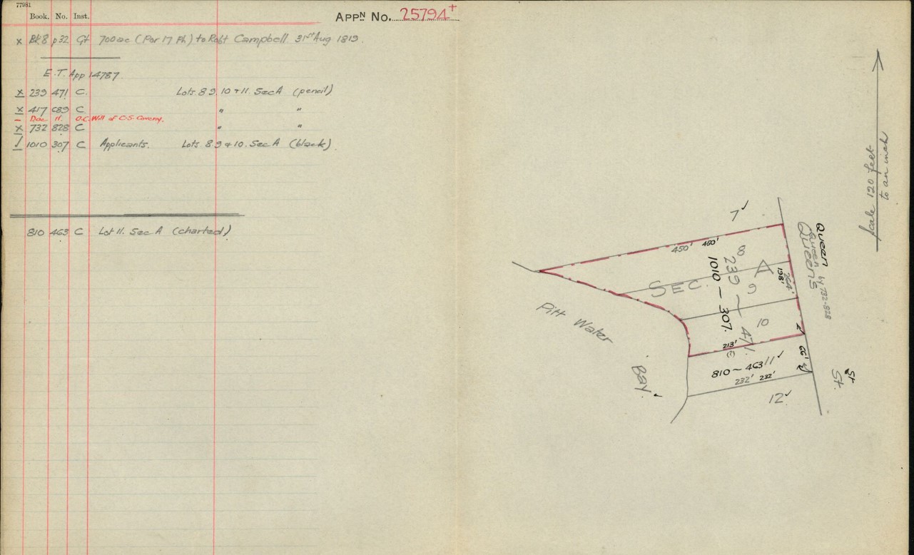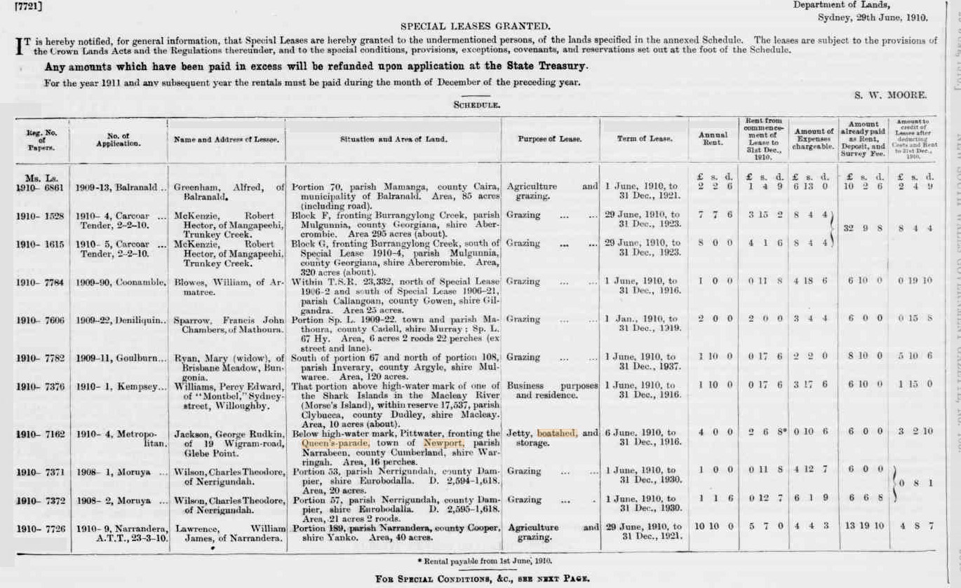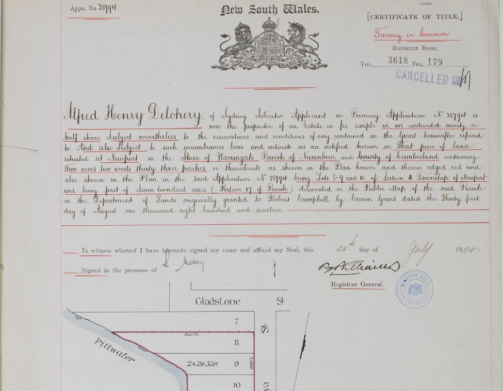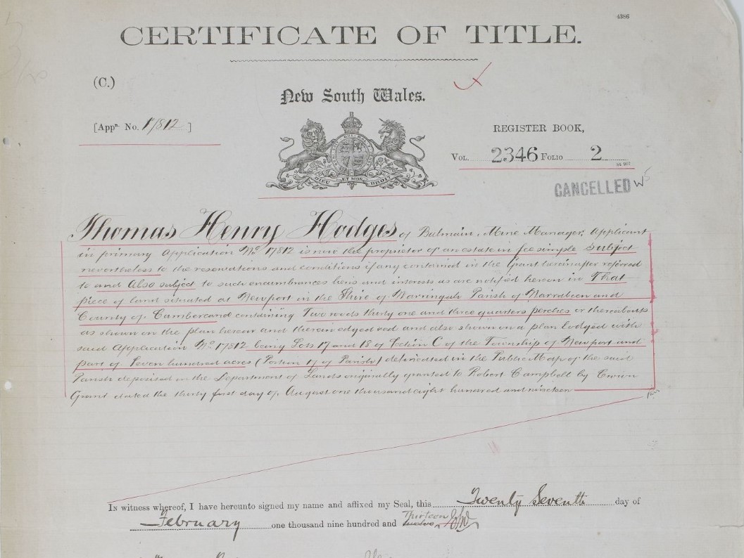 No. 17,812. APPLICANT:—Thomas Henry Hodges, Balmain. LAND:—County Cumberland, parish Narrabeen, shire Warringah, 2 roods 31 ½ perches, Gladstone and Queen streets, Newport,—lots 17 and 18, section C, township Newport, and part 700 acres (portion 17 of parish), granted to Robert Campbell; adjoining properties of M. Johnston and J. Sanderson. NOTICE UNDER REAL PROPERTY ACT. (1912, August 7). Government Gazette of the State of New South Wales (Sydney, NSW : 1901 - 2001), p. 4985. Retrieved from http://nla.gov.au/nla.news-article221605230