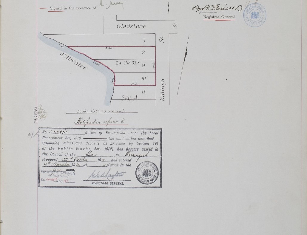 Description op Land referred to. , All that piece or parcel of land situate in the parish of Narrabeen, county of Cumberland, and State of New South Wales, being lots 1, 2, 3 and 4 of deposited plan No. 14,555: Commencing on the high-water mark of Pittwater at the north-eastern comer of the said lot 4 of deposited plan 14,555; and bounded thence on the north-east and south-east by north-eastern boundaries, and the south-eastern boundary of that lot being linos bearing successively 157 degrees 3 minutes 301 feet 6 inches, 152 degrees 51 minutes 73 feet 4 inches and 237 degrees 24 minutes 30 seconds 37 feet 11| inches to the north-eastern side of Bay View road; on the south-west by that side of that road bearing 306 degrees 5 minutes 268 feet 1 inch; on the north-west by the north-western boundary of the said lot 1 bearing 10 degrees 49 minutes 252 feet 7 inches to the high-water mark of Pittwater aforesaid; and again 011 the north-east by that highwater mark bearing south-easterly, to the point of commencement,—having an area of 3 roods 39 ½ perches or thereabouts, and said to be in the possession of Whitaker, Hayman and Co. Ltd. NOTIFICATION OF RESUMPTION OF LAND UNDER THE LOCAL GOVERNMENT ACT, 1919. (1928, February 17). Government Gazette of the State of New South Wales (Sydney, NSW : 1901 - 2001), p. 822. Retrieved from http://nla.gov.au/nla.news-article223011132