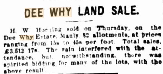 DEE WHY LAND SALE. (1911, January 27). Evening News (Sydney, NSW : 1869 - 1931), p. 5. Retrieved from http://nla.gov.au/nla.news-article113941406