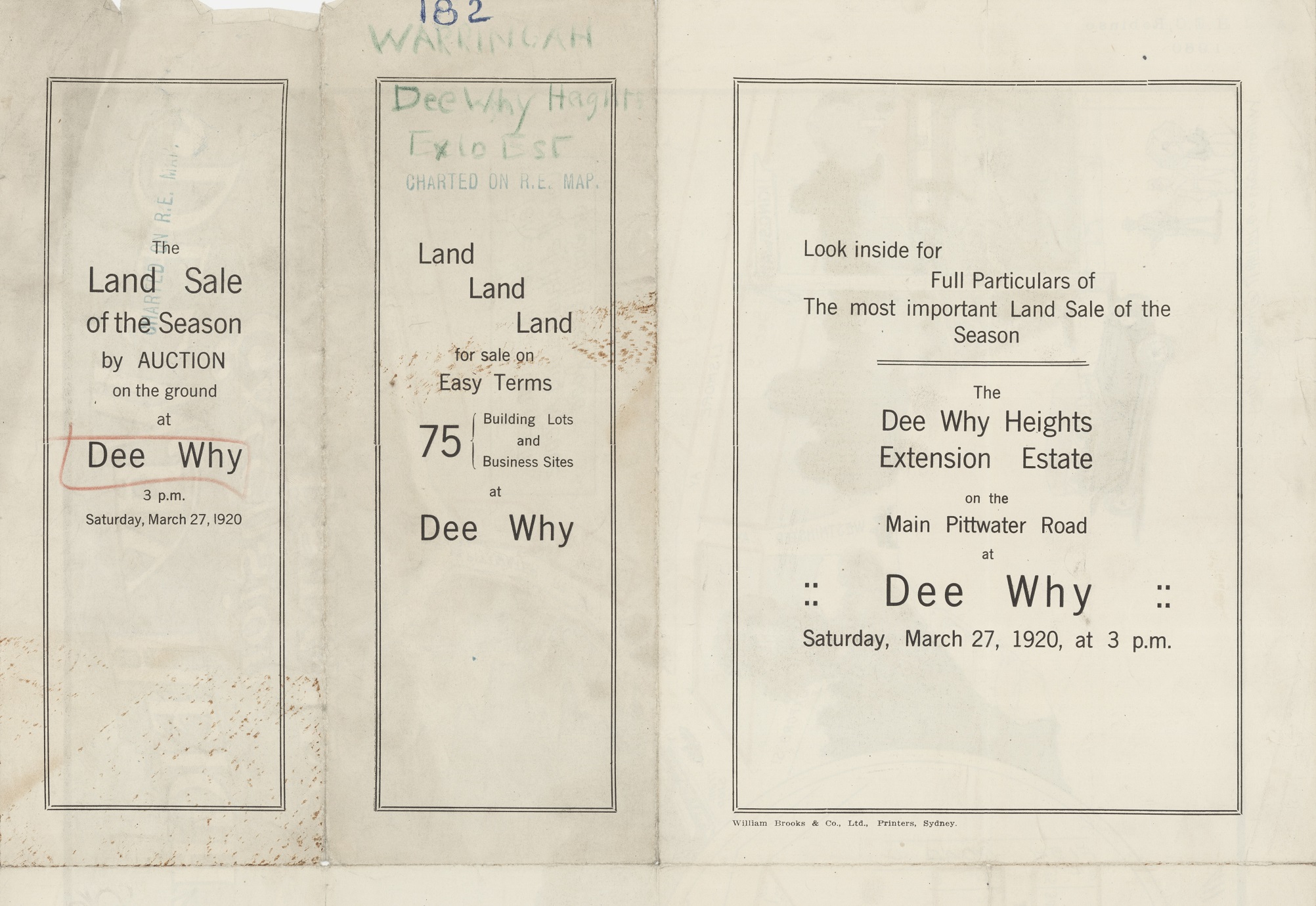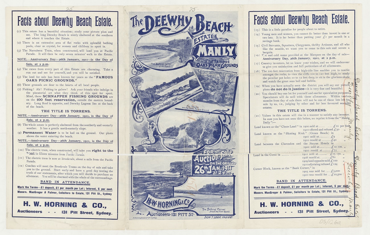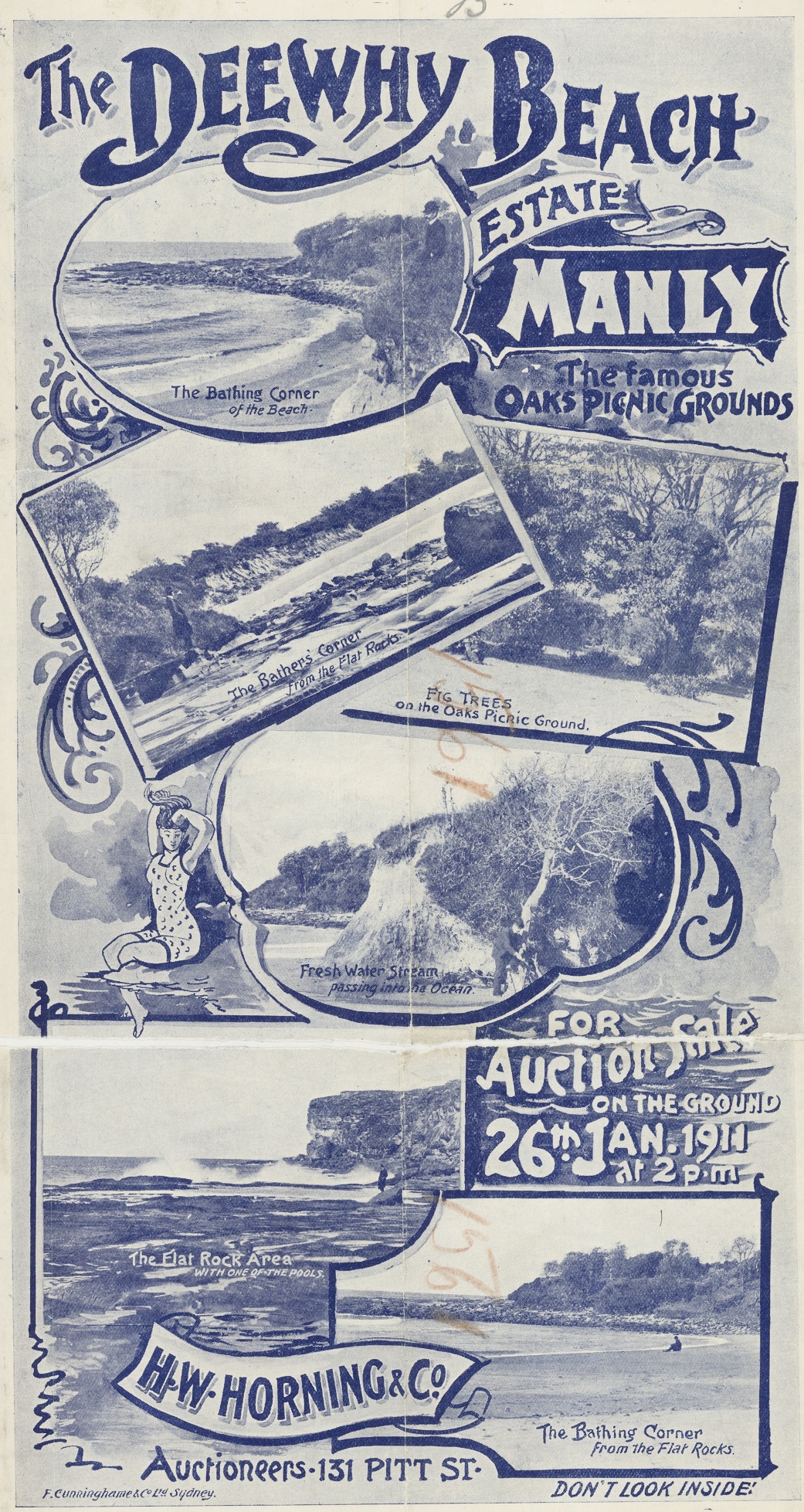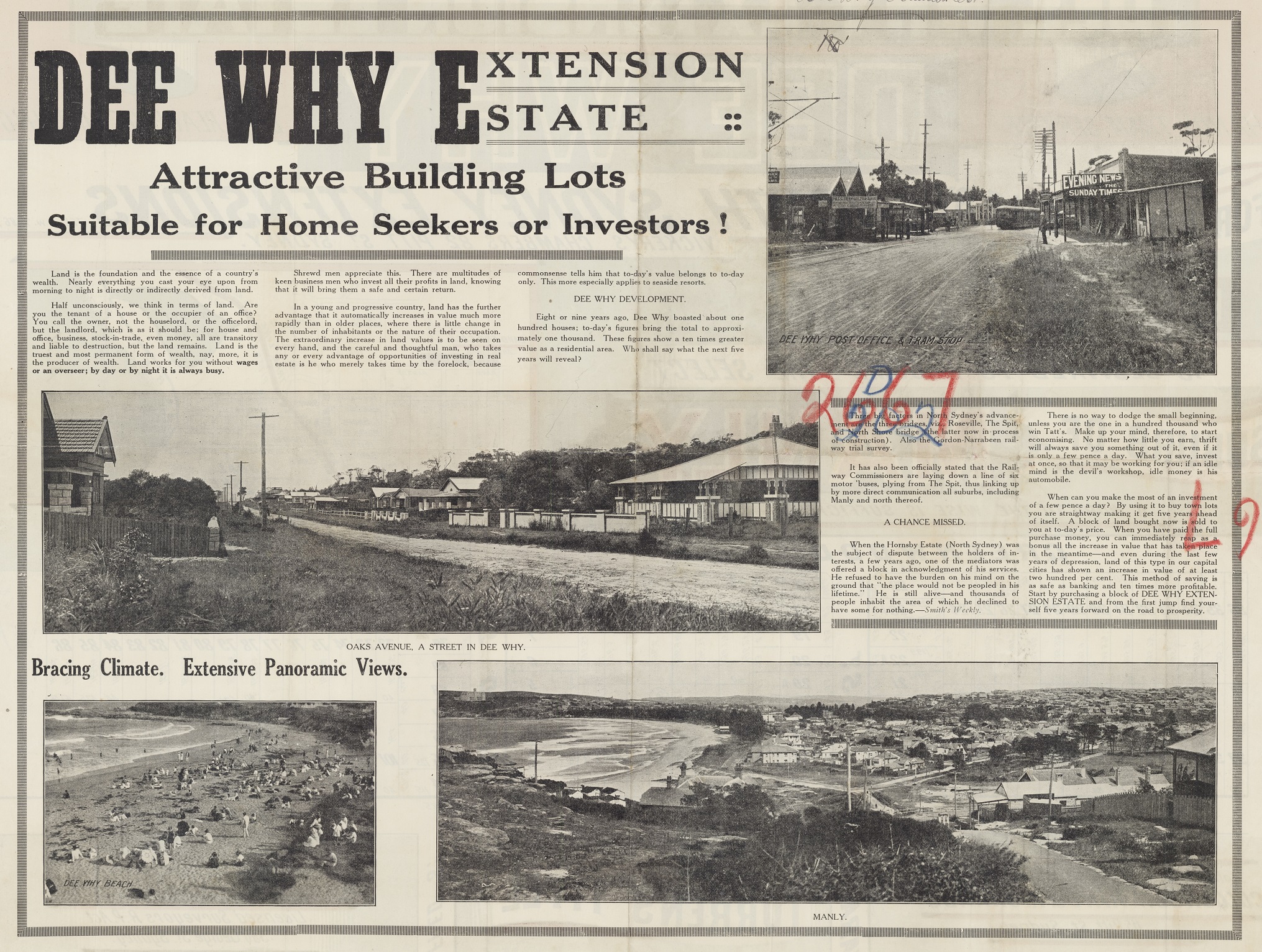 Deewhy Beach Is really not a great distance from the city when one considers that the electric tram, when constructed will be able to land passengers to the Manly boat In fifteen minutes. The whole trip to and from Sydney is therefore well under the hour, but the main point Is that it Is a decidedly refreshing and enjoyable one. To the land speculator the Deewhy Beach Estate offers exceptional Inducements, for, judging by experience in regard to ocean frontages along this coastline, land values are bound to go rapidly ahead. Manly furnishes a striking example of what money can be made by In vestment In this direction. Land sold, only ten years ago from £10 to £15 per foot Is now worth from £30 to £100.. Manly's growing popularity Is bound, when the tram Is extended, to embrace Deewhy Beach, and there is little doubt that values will rise In similar proportion to those at Manly. A great crowd Is expected to attend the sale of the Deewhy Beach Estate on Anniversary Day, and Messrs. Horning and Co. have so provided that the trip may be a picnic as well as a business excursion. DEE WHY BEACH MANLY (1911, January 14). The Sun (Sydney, NSW : 1910 - 1954), p. 4 (FINAL SPORTING). Retrieved from http://nla.gov.au/nla.news-article221565666