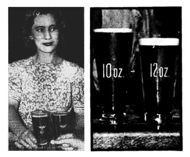 Left: Barmaid, Bonnie Reece in a Sydney hotel with the new “middy” February 1941. Picture: Daily Telegraph. Right: The new beer glass which will make its appearance in Queensland hotels to-day compared with the 12oz glass at present in use –The Brisbane Courier Mail Saturday 15 February 1941