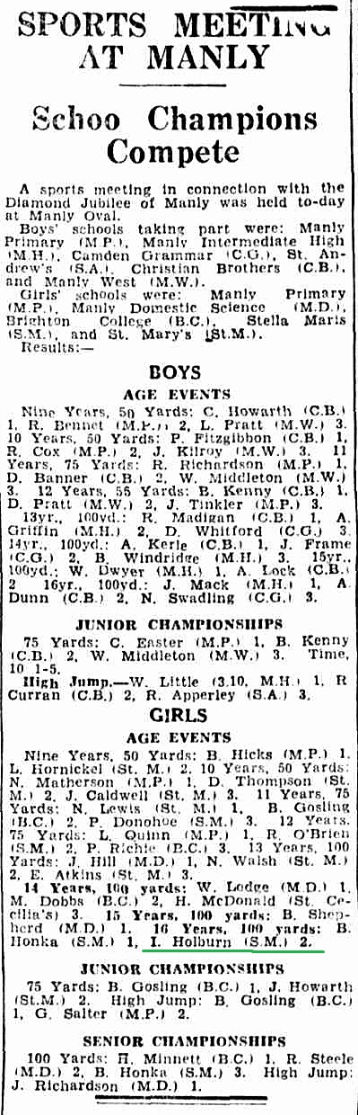 Isa attended Dee Why Public School between 5 and 11 years of age and then the Manly Domestic Science High School in Darley Road, Manly, which was where Manly Public (or Village) School now stands. Isa was winning intra-school sprint competitions - see 1937 clipping below - and in 1936 was winning out of school swimming competitions as well.