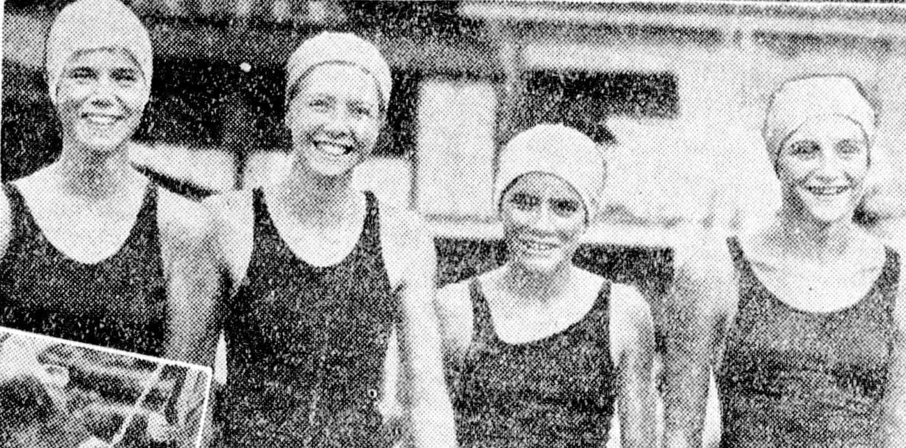 Winning relay team at Manly Domestic Science School swimming carnival yesterday. From left: B. Green, G. Howes, I. Holburn, and M. Steele.