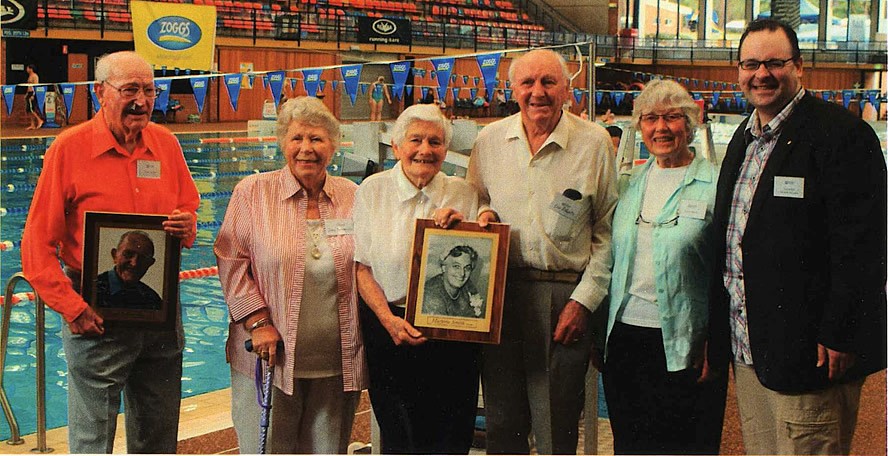 L to R: Jamie Jenkins with photo – Stuart Somerville OAM, Joan Somerville OAM, Isa Wye MBE OAM with photo – Marjorie Smith OAM, Don Roberts, Sunny Bidner and Cr Vincent De Luca OAM. Image courtesy Warringah ASA