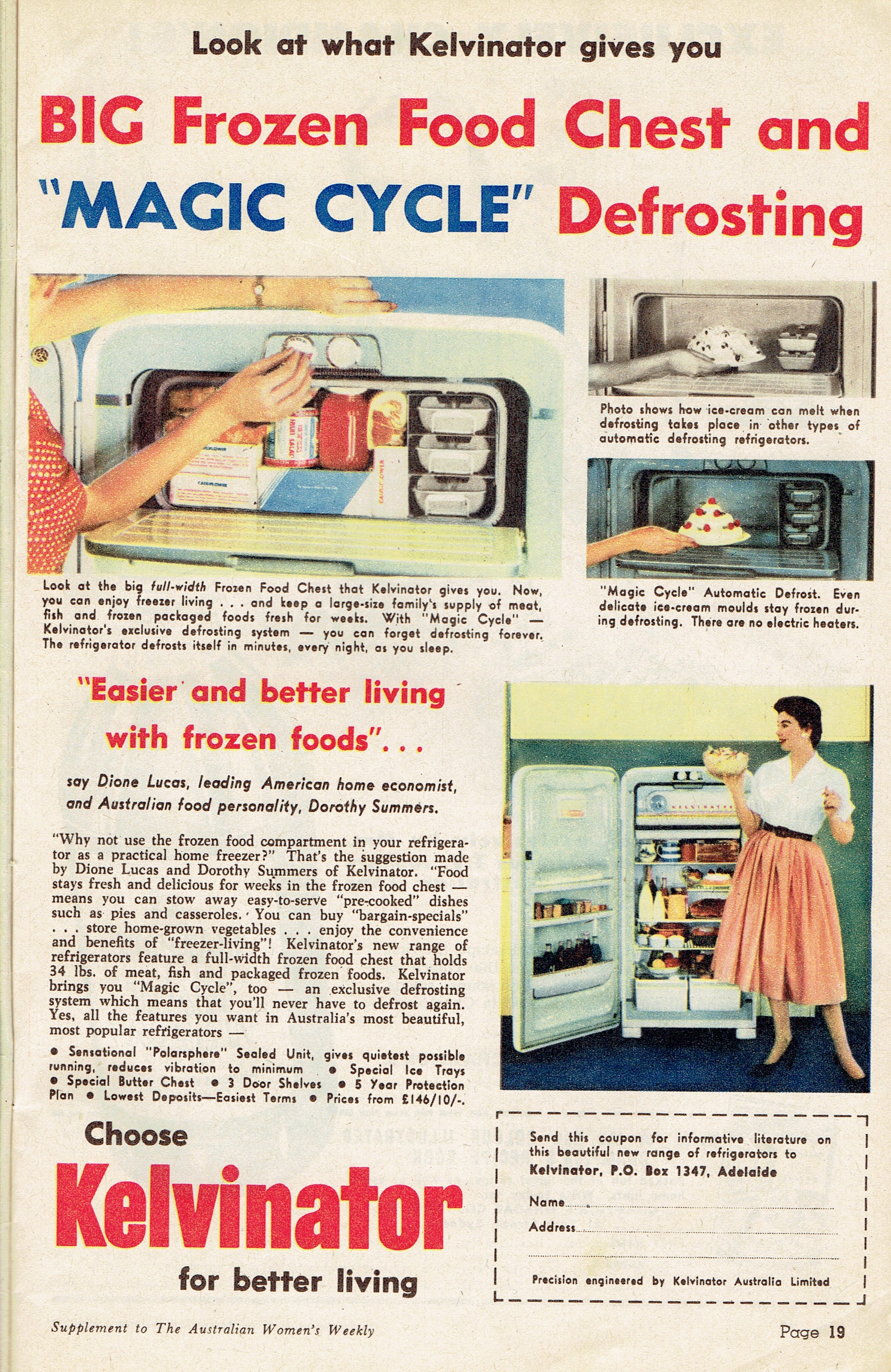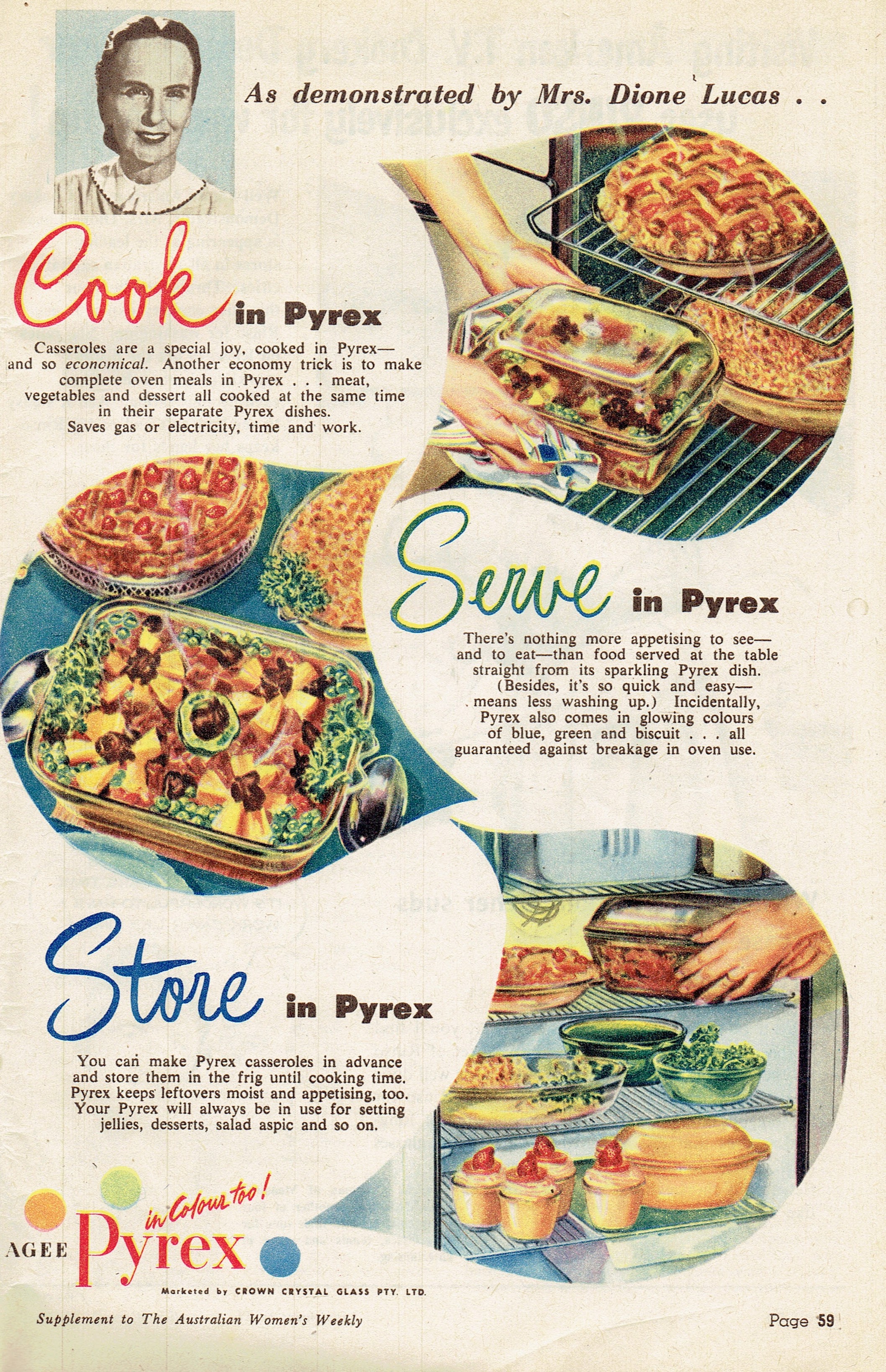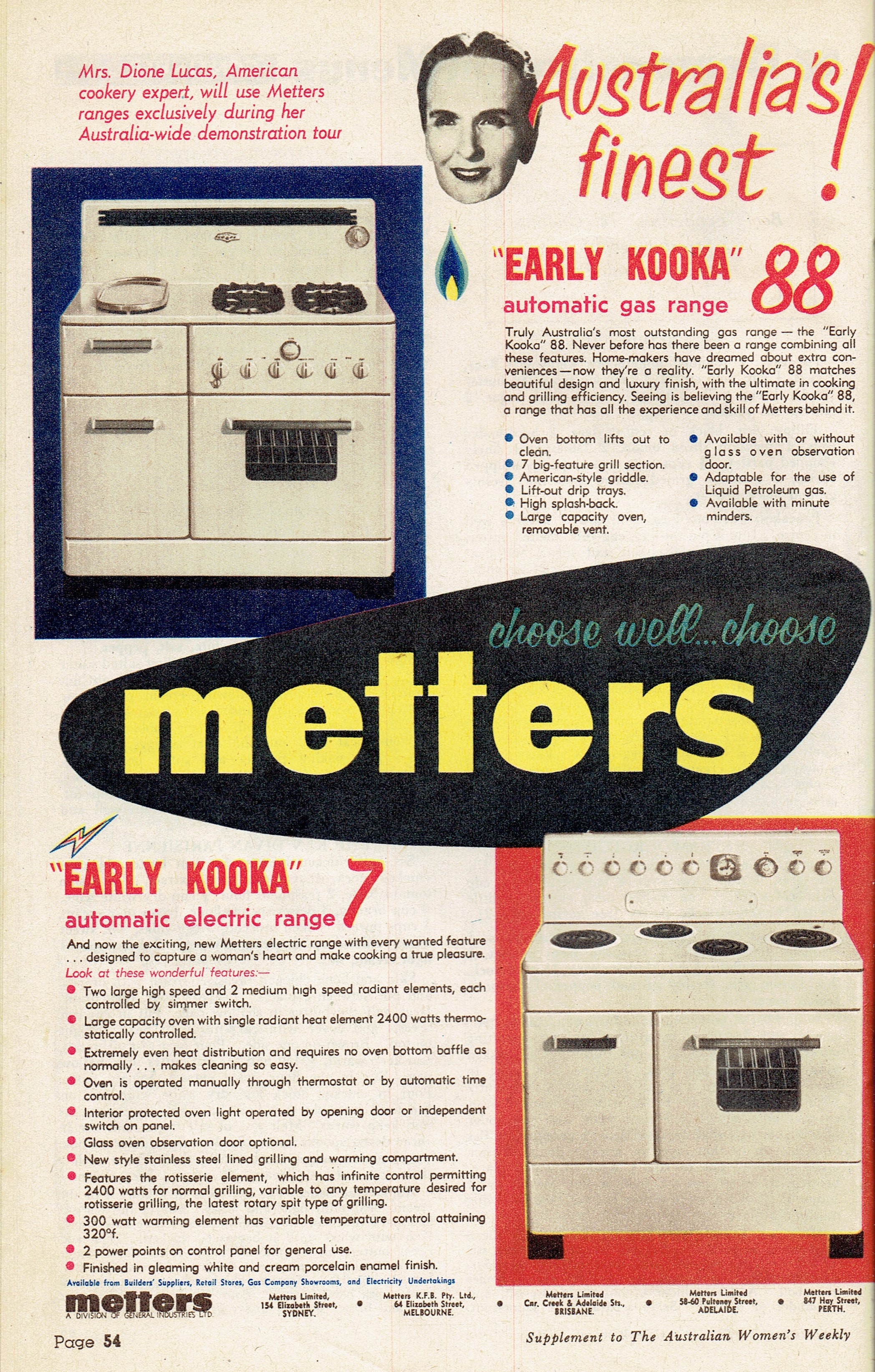 Dione Lucas cookbook supplement in The Australian Women's Weekly, 1956 - advertisement examples - how many of these companies or products remain today?: