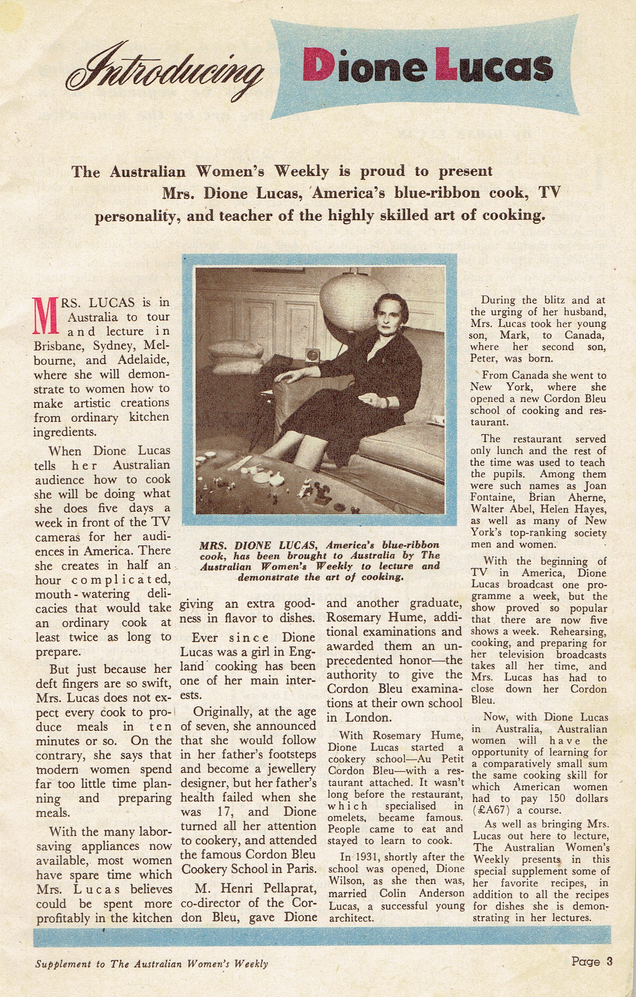 Fans of the movie Julie & Julia may be interested in the work of Dione Lucas, who toured Australia in the 1950s and 1960’s.