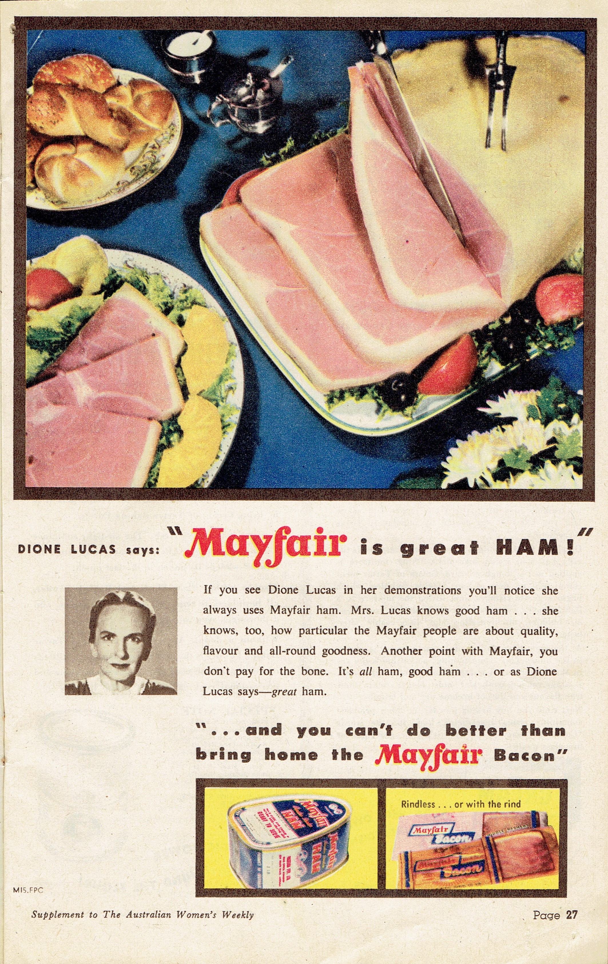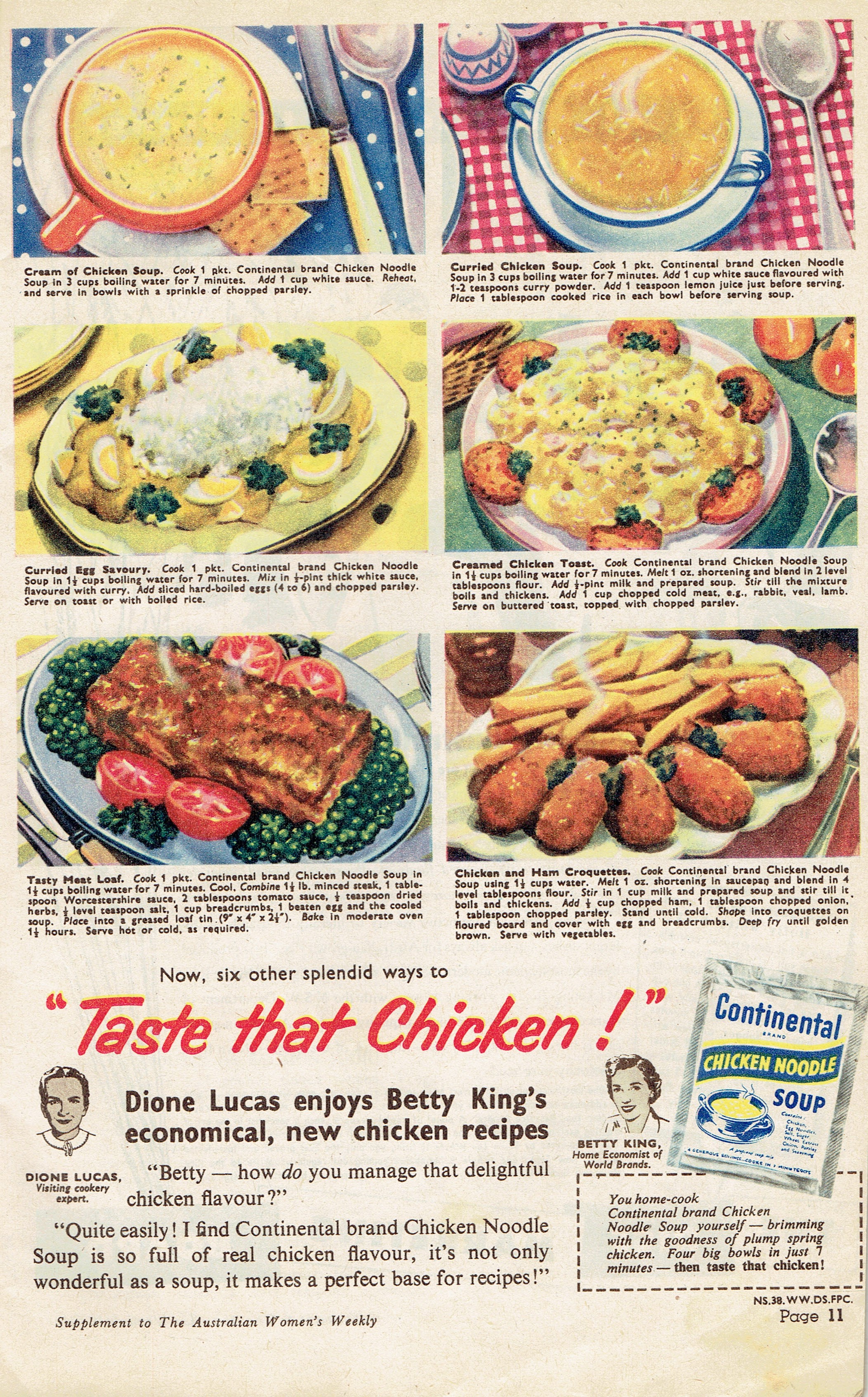 A 1956 supplement to The Australian Women’s Weekly includes dishes still popular today, such as Caesar salad, cheese soufflé or Lemon Meringue Pie, along with endorsement style advertisements for everything cooking related from products to machines, although some you may wonder about as true Cordon Bleu ingredients – for instance – chicken stock powder or chicken noodle soup from Continental. No true chef or cook uses stock powder! You make your own stock. Tinned ham? No..... definitely not.