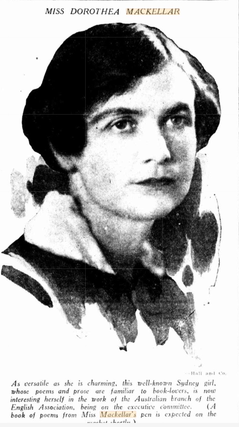 Poetess and Novelist Dorothea Mackellar (1927, March 10). The Daily Telegraph (Sydney, NSW : 1883 - 1930), p. 5 (The Daily Telegraph Woman's Supplement). Retrieved from http://nla.gov.au/nla.news-article245876867