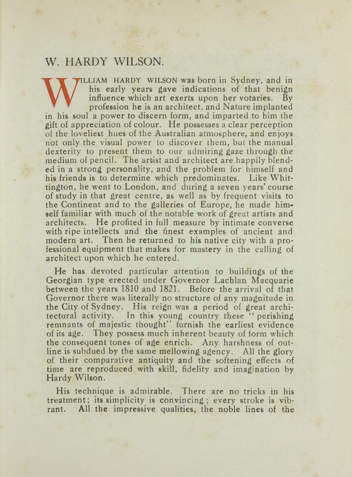 William Hardy Wilson was an Australian architect, artist and author. Determined to make Australians as aware of their early colonial heritage, Wilson made drawings of colonial buildings in New South Wales and Tasmania: he 'looked at buildings with a painter's eye as much as an architect's', even noting the plants in their gardens. In 1924, his 'Old Colonial Architecture in New South Wales and Tasmania' was published containing 50 collotypes of his drawings.