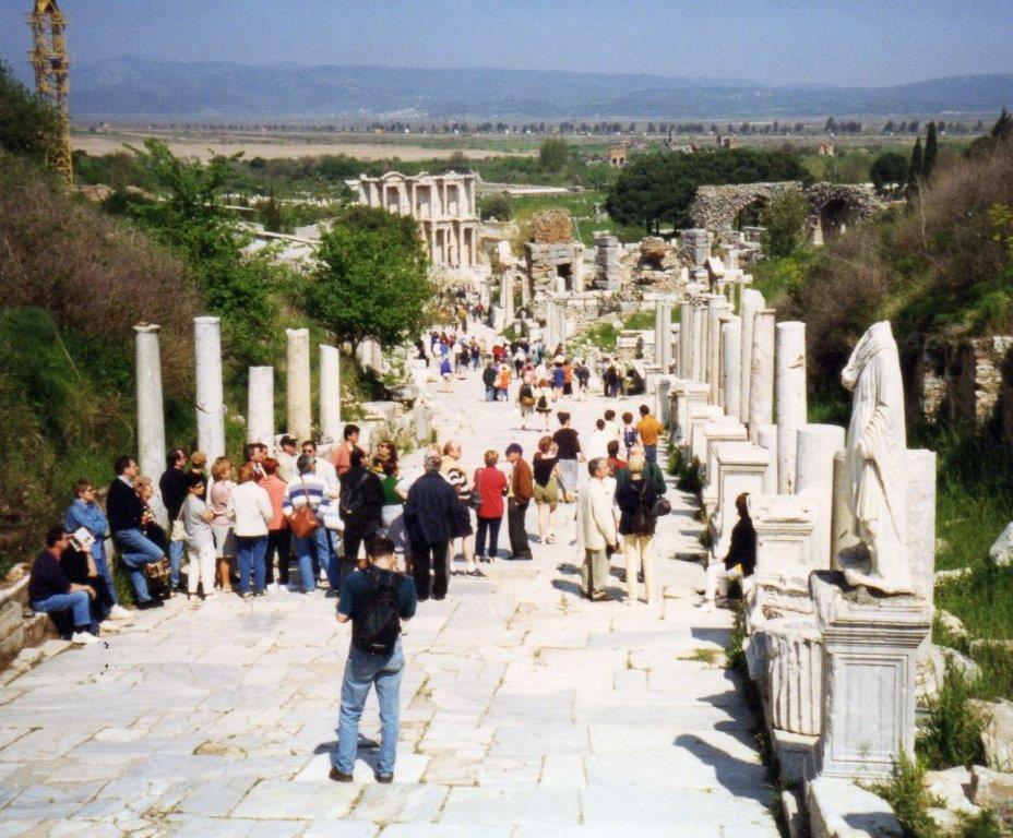 Probably the most visited tourist destination in Turkey, Ephesus receives tens of thousands of visitors each year. They come by land and in cruise ships. Those who arrive by land usually have sufficient time on the site to explore, and to absorb something of the atmosphere of the Roman ruins, which are being progressively restored. On the other hand cruise passengers are delivered from their ships in large numbers, shepherded in crowds, rapidly, through the ruins and then herded back into coaches for the return to their ships. Few of them are left with any real understanding of what they have seen.