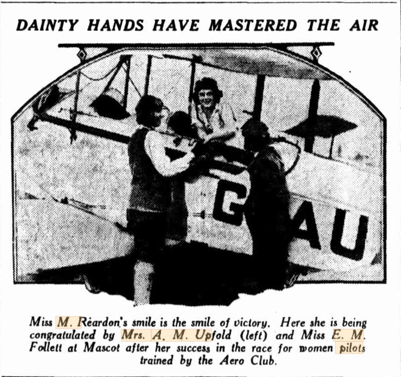 "THE OAKS," 10 1/2 miles, for women pilots trained by the club.-Miss M. Reardon, 1; Mrs. A. M. Upfold, 2; Miss E.M. Follett, 3. Time, 9min. 48sec. Average speed, 66 miles per hour. AERIAL PAGEANT (1928, April 2). The Brisbane Courier (Qld. : 1864 - 1933), p. 20. Retrieved from http://nla.gov.au/nla.news-article21238885