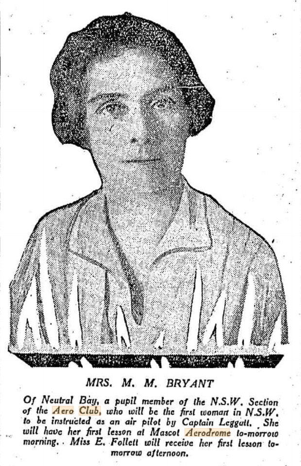 Evelyn has her own place in Australian aviation history : "Miss E. M. Follett OFFICIAL information embodied in an article in this paper last week referred to Miss E. M. Follett as having secured her 'A' licence for solo flying on July 11, 1929. The actual date was two years earlier. Miss Follett received her certificate from the Aero Club in 1927." She was the third woman in Australia to receive this certificate : "Miss Evelyn Follett (Castlecrag), licence No. 109, dated August 29, 1927".