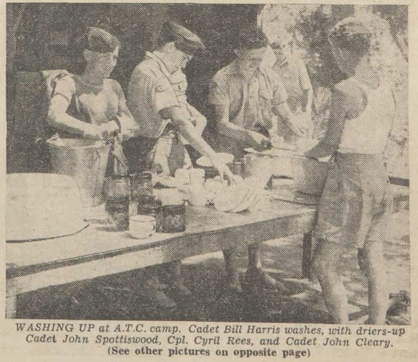 WASHING UP at A.T.C. camp. Cadet Bill Harris washes, with driers'-up Cadet John Spottiswood, Cpl. Cyril Rees, and Cadet John Cleary.