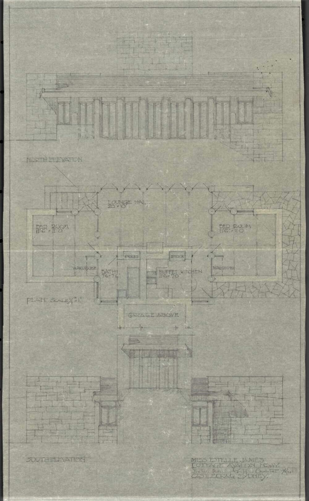 Griffin, Walter Burley. (1933). Sketch floor plan and north and south elevations for cottage for Miss Estelle James, Avalon, New South Wales Retrieved from http://nla.gov.au/nla.obj-150363250