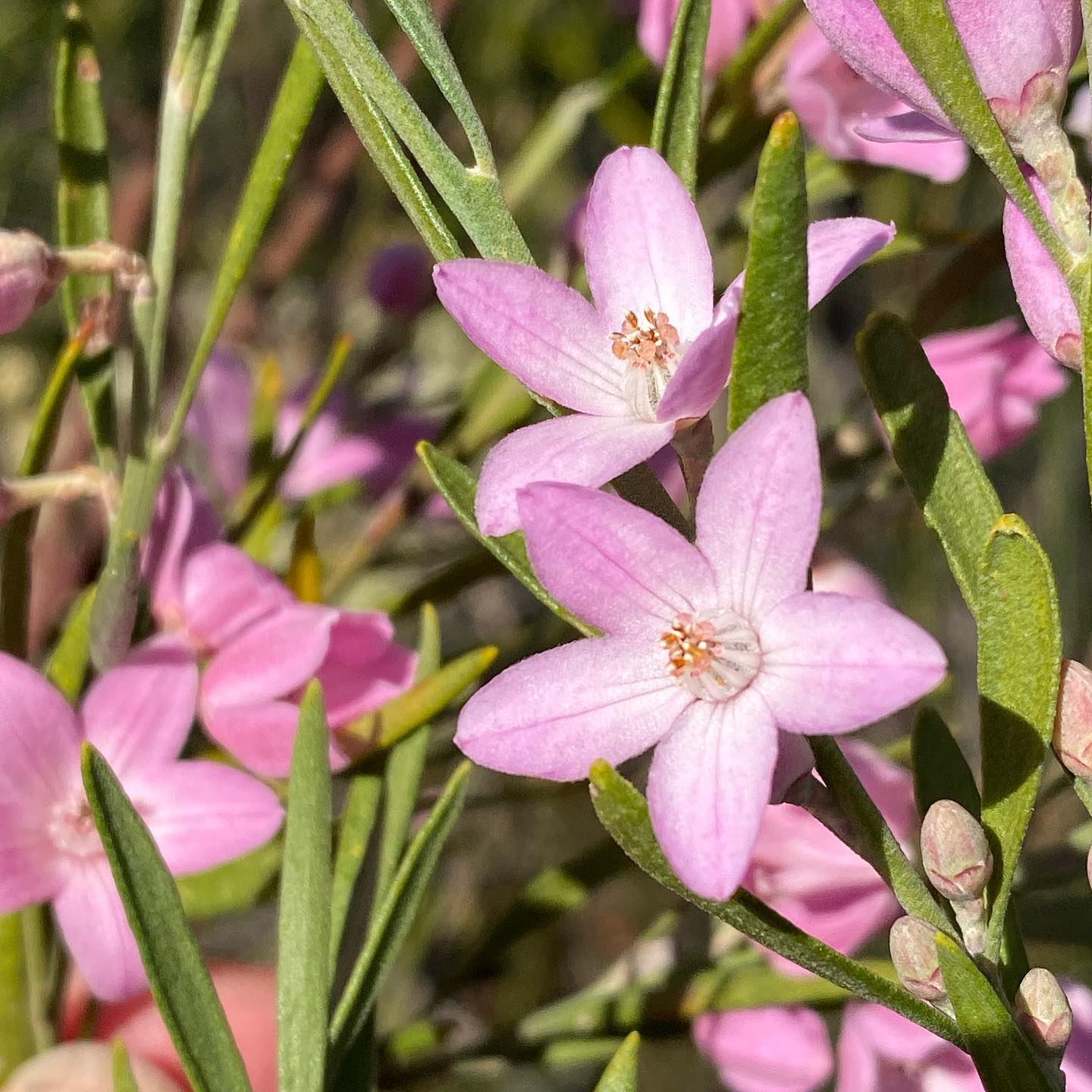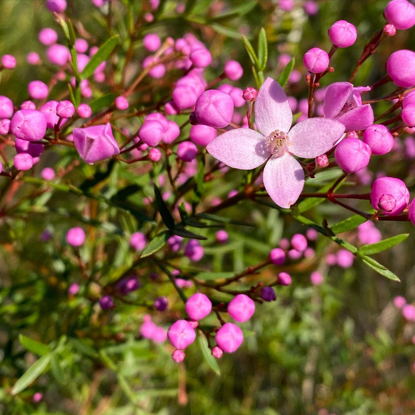Ledum Boronia aka Boronia ledifolia - The underside of the petals when seen in bud are red. The strong scent of the foliage comes from oil glands. This identifies it as a member of the Rutaceae plant family which includes citrus and the herb Rue. Information courtesy Pittwater Natural Heritage Association (PNHA)