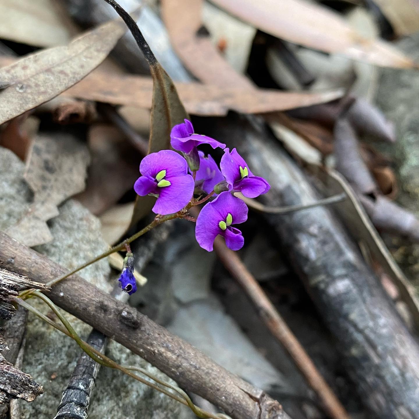 False Sarsaparilla (Hardenbergia violacea) is a species of Australian flowering Native plant, known in Australia by the common names false sarsaparilla, purple coral pea, happy wanderer, native lilac and waraburra (which comes from the Kattang language; Worimi, or Gadjang (also spelt Kattang, Kutthung, Gadhang, Gadang, Gathang) is an Australian Aboriginal language of New South Wales). It grows as a climbing vine, but also as a subshrub. Flowering in late Winter and all through Spring.