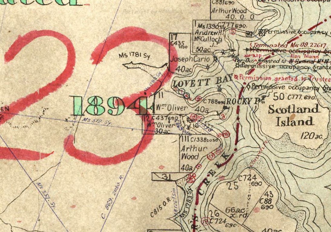 William Oliver's other 40 acres on Lovett Bay - Portion 11 - Vol.34 Fol.84 in Land Titles Office becomes Vol-Fol 872-106 after passing through Samuel Crawford to Thomas William Willans.