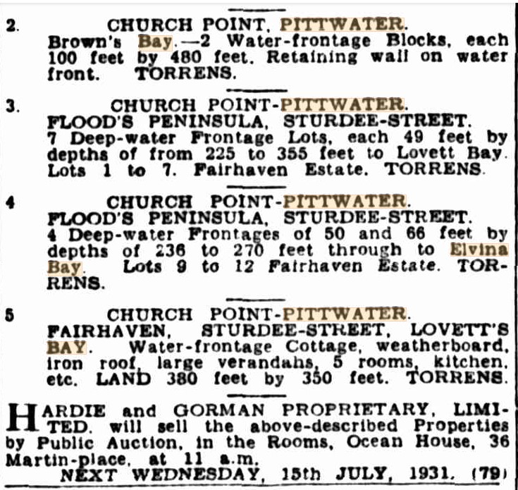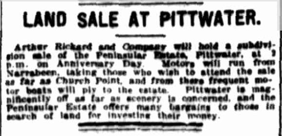 RICHARDSON and WRENCH have received instructions to sell by public auction at the Rooms, Pitt-street,' on FRIDAY, 19th MAY, at 11 o'clock, The ABOVE-DESCRIBED 30-ACRE FARM at Pittwater, within easy distance- 1 ½ mile -of the Newport STEAMERS' WHARF. Terms at sale. Advertising (1882, May 17). The Sydney Morning Herald (NSW : 1842 - 1954), p. 11. Retrieved from http://nla.gov.au/nla.news-article13511387