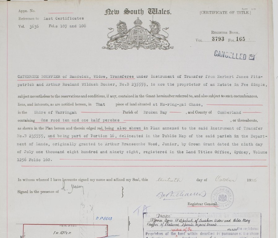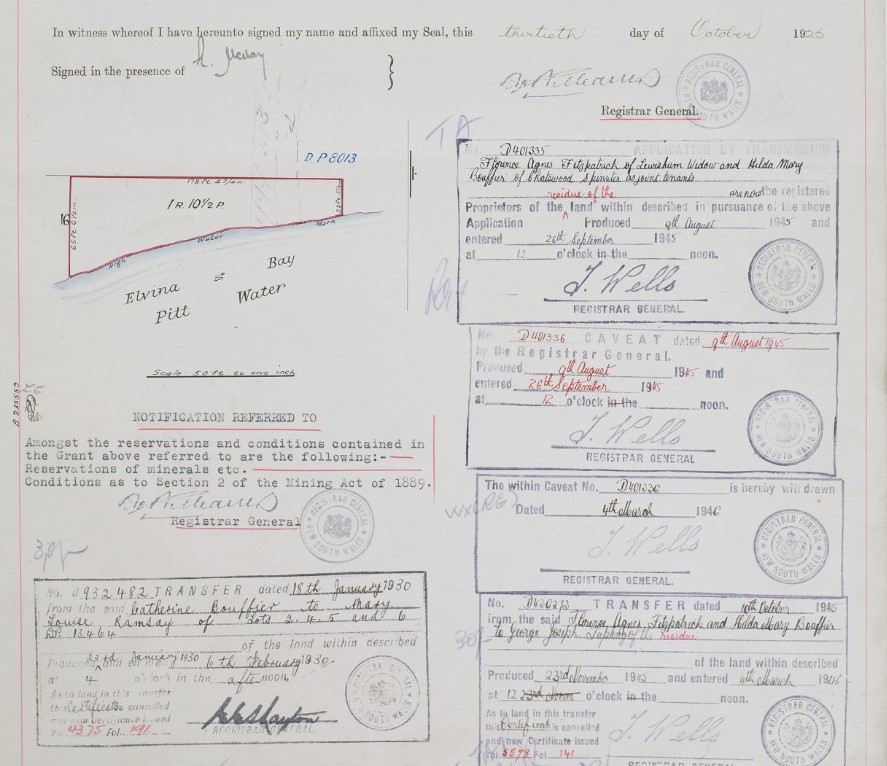 The HRLV and Land Titles Office, along with Maybanke Anderson's History of Pittwater states ownership of the Oliver land on the Elvina peninsula was transferred to Samuel Crawford on 15 July 1881;