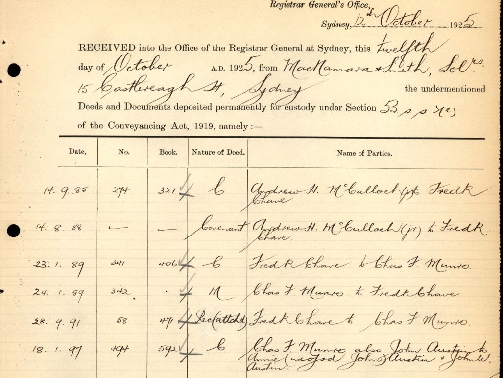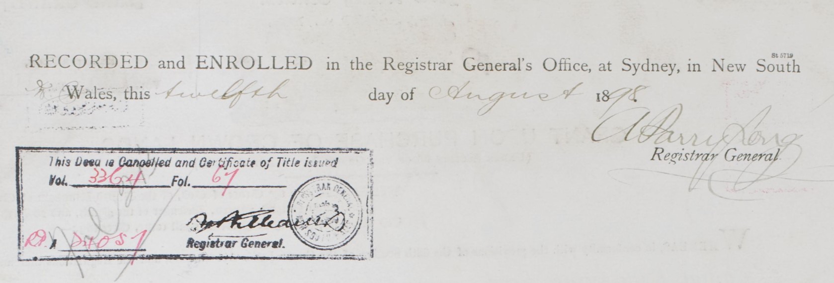 Lot 4 sells to Frederick Augustus Oatley and Joseph Washington Flood on November 13 1890 (Vol-Fol 992-91 and 92) they had also made a mortgage available to him prior to this. Lot 4 is where the site of the future 'Fairhaven' will be built. Steffani buys Lot 19 in Subdivision A on December 18 1891 (Vol-Fol 1039-119)