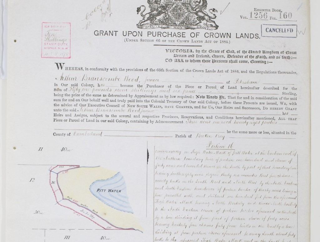 County of Cumberland, parish of Broken Bay, at Pittwater; Commencing on the high-water mark of Pittwater at a point bearing north 88 degrees 30 minutes east, and distant 8 chains 60 links from the south-west corner of applicant's property; and bounded on the south-west by a line bearing south 12 degrees 45 minutes east 6 feet; on the north-west by a line at right angles bearing south-westerly 8 feet; again on the south-west by a line at right angles bearing south-easterly 18 feet; again on the south-east by a line at right angles bearing north-easterly 8 feet; again on the south-west by a line at right angles bearing south-easterly 30 feet; again on the north-west by a line at right angles bearing south-westerly 14 feet; again on the south-west by a line at right angles bearing south-easterly 15 feet; again on the south-east by a line at right angles bearing north-easterly 30 feet; again on the north-east by a line at right angles bearing north-westerly 15 feet; again on the northwest by a line at right angles bearing south-westerly 7 feet; again on the north-east by a line parallel to the first-mentioned boundary bearing north-westerly about 54 feet to the said high-water mark; and again on the north-west by that high-water mark south-westerly, to the point of commencement. About 4 perches – for do… – Annual rent £2. LEASES FOR SPECIAL PURPOSES.—OBJECTIONS CALLED FOR. (1891, November 11). New South Wales Government Gazette (Sydney, NSW : 1832 - 1900), p. 8885. Retrieved from http://nla.gov.au/nla.news-article219924056