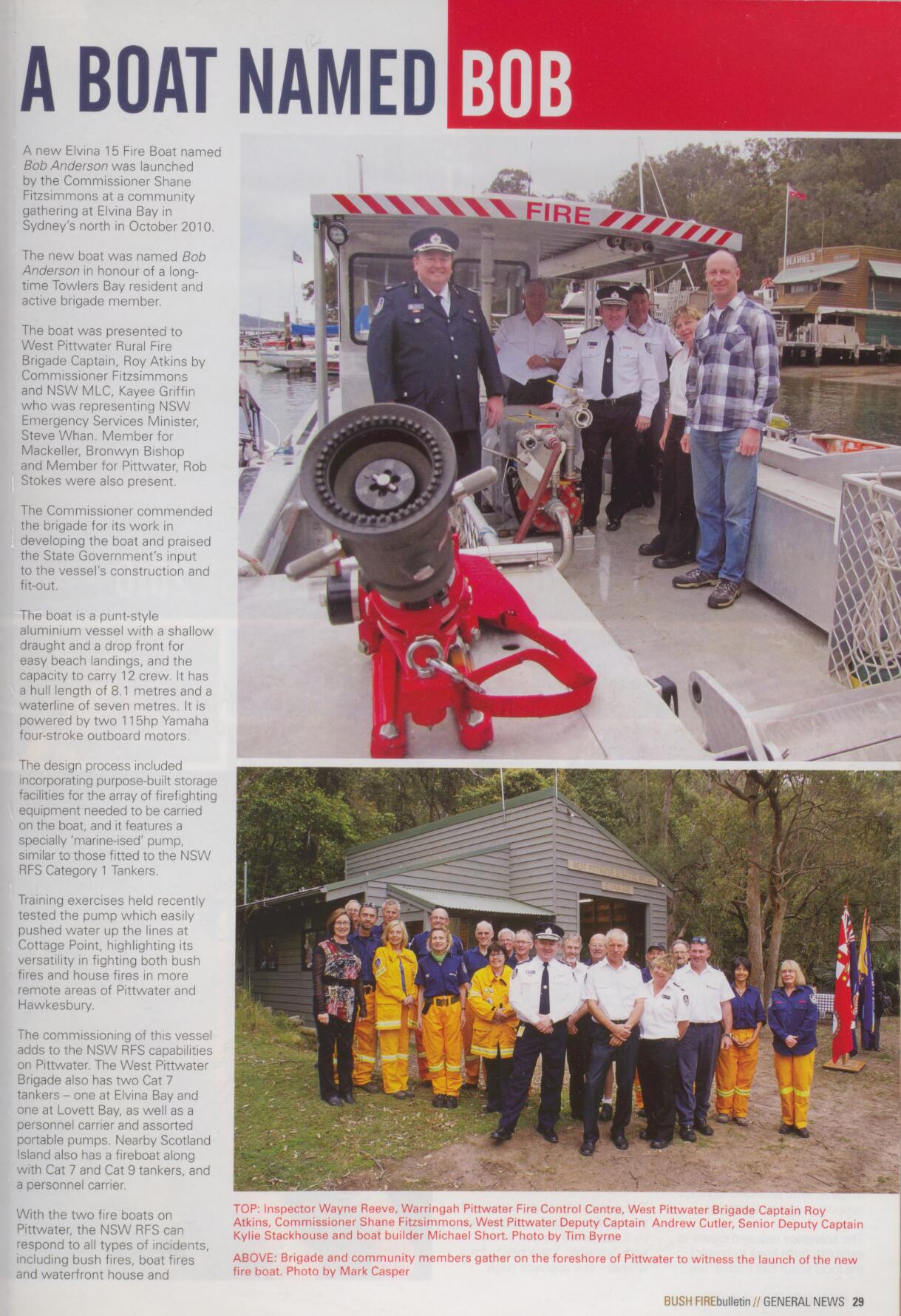 Bush Fire Council of New South Wales & NSW Rural Fire Service. (Vol 33 No.1 2011). A BOAT NAMED BOB, Bush fire bulletin Retrieved from http://nla.gov.au/nla.obj-293018842